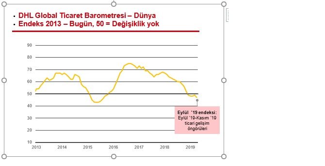 Bonn, 15 Ekim 2019: DHL Global Ticaret Barometresi (GTB), dünya ticaretinde küçük çaplı bir düşüş öngörüyor. Toplam endeksin 1 puan gerileyerek 47’ye düşmesi, global ticaretin önümüzdeki 3 ayda ivme kaybetmeye devam edeceğine işaret ediyor. Öte yandan, GTB endeksinin 8 puanlık düşüş kaydettiği haziran ayındaki güncellemeden bu yana, aşağı yönlü eğilim fark edilir ölçüde yavaşladı.