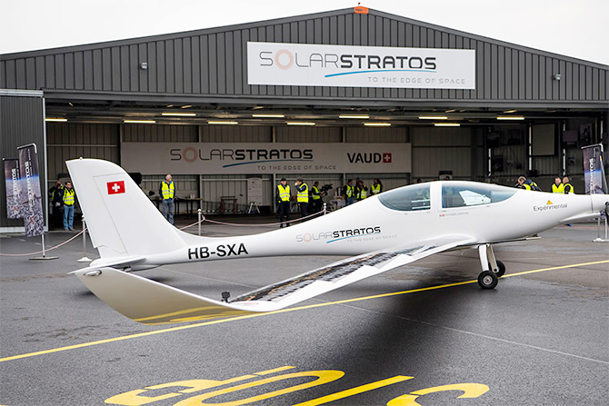 Tarihteki ilk iki kişilik ticari güneş enerjili uçak, İsviçre’de deneme uçuşu için havalandı. Uçağın pilotu Raphael Domjan, havalanmadan önce uçağın önünde bir poz verdi. Elktra-Solar GmbH tarafından tasarlanan uçağın kanat genişliği 24 metre, ağırlığı 450 kilo. Asıl uçuşunu 2018 yılında yapacak olan SolarStratos isimli uçağın 75 bin feet (22 bin 860 metre) yükselerek strasforda uçacağı belirtildi.