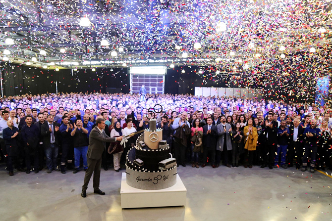 1967 yılında Otomarsan ismiyle kurulan ve bu yıl 1 milyar Avro’yu aşan yatırımıyla Türkiye’nin en büyük yabancı sermayeli şirketlerinden biri olan Mercedes-Benz Türk, 2017 yılında 50. yılını kutluyor. Yarım asırdır Türkiye’de faaliyet gösteren şirket, resmi kuruluş yıldönümü için çalışanlarıyla bir araya geldi ve bu özel günü keyifli bir doğum günü etkinliği ile kutladı.