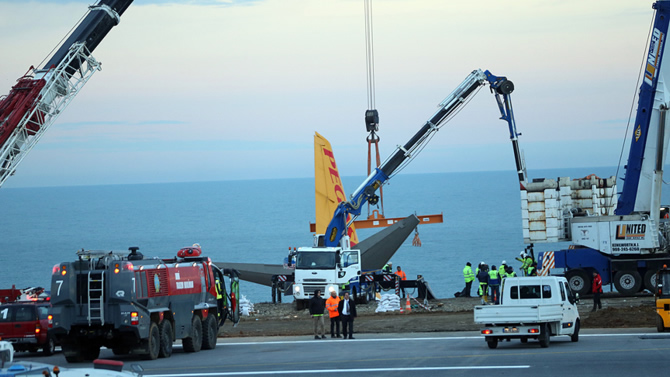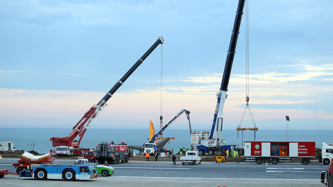 Trabzon Havalimanı'na indikten sonra pistten çıkan ve iniş takımları denize bakan dik yamaçta balçığa saplanması sonucu durabilen yolcu uçağının kaldırılması amacıyla Devlet Hava Meydanları İşletmesine bağlı Havalimanı Kurtarma ve Yangınla Mücadele Birimi ekiplerince başlatılan çalışmalar devam ediyor.